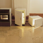 Lamp towards the Mirror: The mirror reflects the image of the lamp pointed at it and thus creates the illusion of the existence of an identical space and another lamp in it. The mirror also diffuses the light of the lamp into the surrounding space. This secondary, false space exists at the same time and is completely dependent on the primary space.